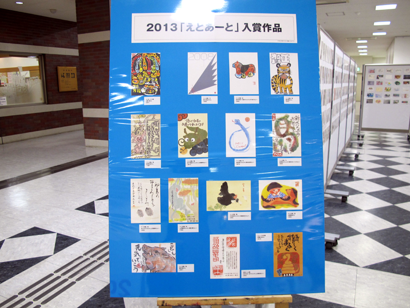 えとあーと受賞年賀状(つやま芸術祭推進委主催)が2013年3月2日~10日まで、市立図書館前に展示してあります。(2013.3.3)