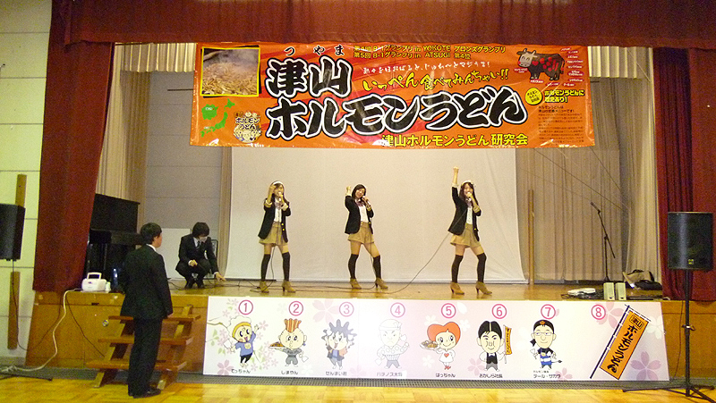 今回で3回目の出展となる津山ホルモンうどん研究会のB-1前恒例の壮行会が、下記の日程で開催されました。日頃応援してくださっている関係者の皆様をお招きし、B-1グランプリで提供するホルモンうどんを実際に調理し、味の最終チェックを行うとともに、配置や役割分担の確認、今回PRステージを担当してくださる津山ご当地アイドル「SakuLove(サクラブ)」や奈義町ダンスチーム「berrys(ベリーズ)」のパフォーマンスもご披露されました。姫路に津山の元気を持っていくことを合言葉に、研究会の意気込みを感じていただけたと思います。(参加費1,000円)