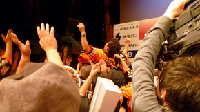 発表が終わり、会場へ皆で移動し舞台で胴上げ。