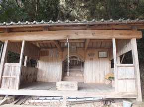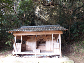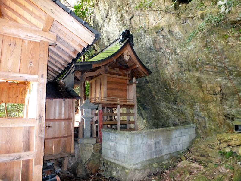 ▲真宮神社拝殿・本殿の背後には巨大な岸壁がある。
