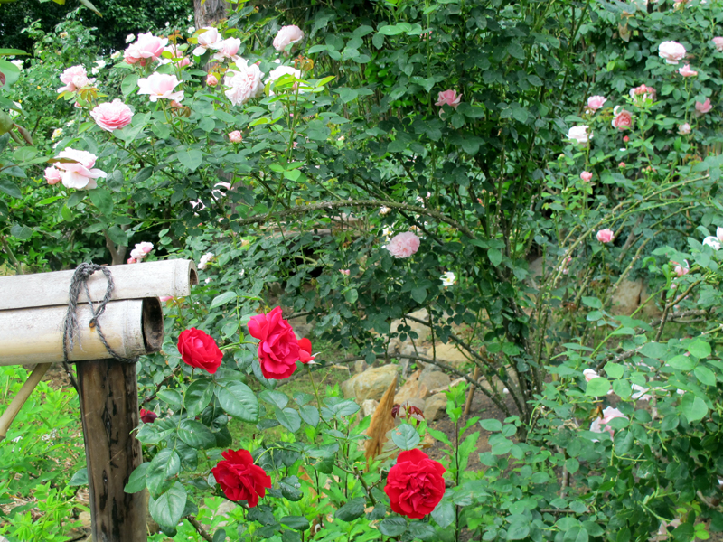 森田さんご夫妻は大阪府から5年程前(2007年)にこちらに来られ、広いお庭や自宅前の畑などを1年目は開墾、2年目から順次バラ園を作ってこられたそうです。このバラ園の名は「里山華農園349」で、多くの人に知ってもらい楽しんでいただきたいとおっしゃっておられました。