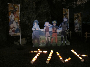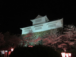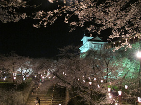 2013年4月3日午後6時半から美作国建国1300年の記念イベントで、公園南側の石段から本丸まで1300個の竹灯籠が並べられ、夜桜見物に来られたみなさんは「わぁ~、きれい!」と上を向いたり、下を向いたりしながら記念撮影なさっていました。本当に綺麗ですが、残念ながら竹灯籠は4月3日のみでした。(2013.4.3)