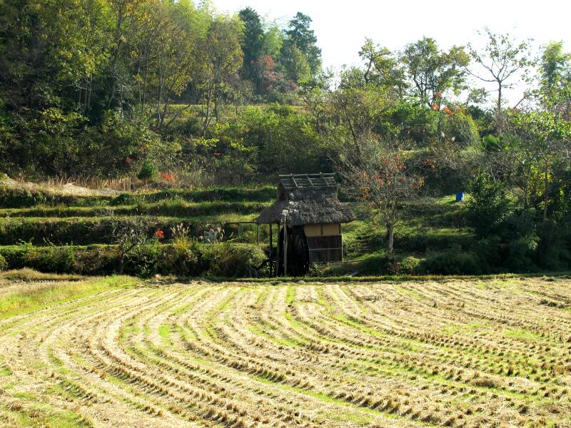 桐の木水車は津山市内で現役で稼働している共有の米搗き水車としては唯一のものです。昭和30年頃まではどこの村々でも共同で水車が維持管理され、村の生活と田園風景を構成していました。この桐の木水車も昭和初期に建設され地元「水車講連中」により維持されてきました。