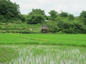 2014年6月28日勝部付近を通り、田植え後の緑の綺麗な中でひときわ目立っていた水車を撮ってみました。場所は勝部東公会堂のすぐ近くです。