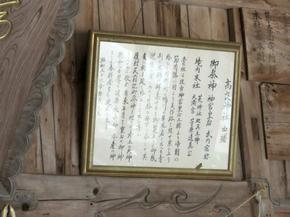 後村民前記御祭神を祀りて産土の大神として崇敬す 爾来年月を重ねて御神徳愈厚く健康長壽神 安産の神として参拝者多く現在に至る 昭和五十六辛酉歳元旦(額より)