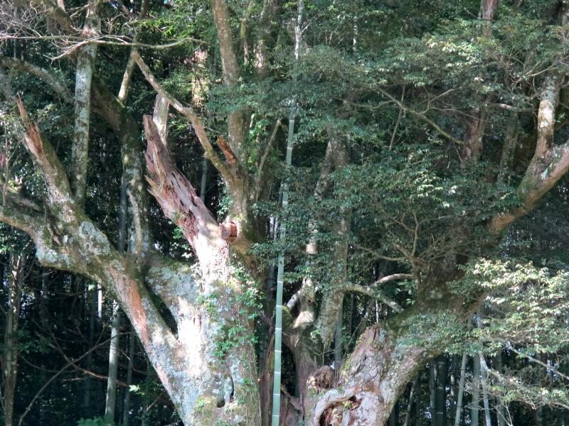 本樹は、根元は一本であるが根元近くから双幹に分かれ、さらに上部で複数に枝分かれし、特異な型をしている。根元に若宮神社が祀られている。2016年10月10日撮影(文:津山の名木百選より)