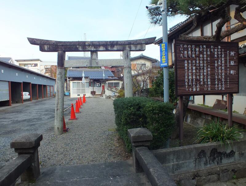 所在:津山市河原町12 祭神:宇迦之御魂神(うかのみたまのみこと〉 創建:正徳2年(1712)勧請 祭礼:夏祭7/24 敬老祭9/15 秋祭10/24