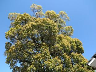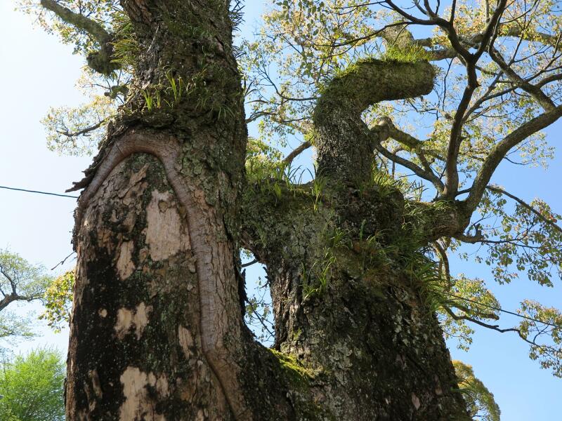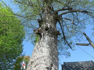 この木は徳守神社の社前にある椋と兄弟木という言い伝えがある。その神木伝説があるから社殿と一緒に残ったわけで、四百年ならば、築城記念の中に加えなければなるまい。徳守神社の表の石垣にもたれる椋も大きいこと周知の通りである。(文:故 白石哲氏)(2017年4月23日・24日、9月2日撮影)