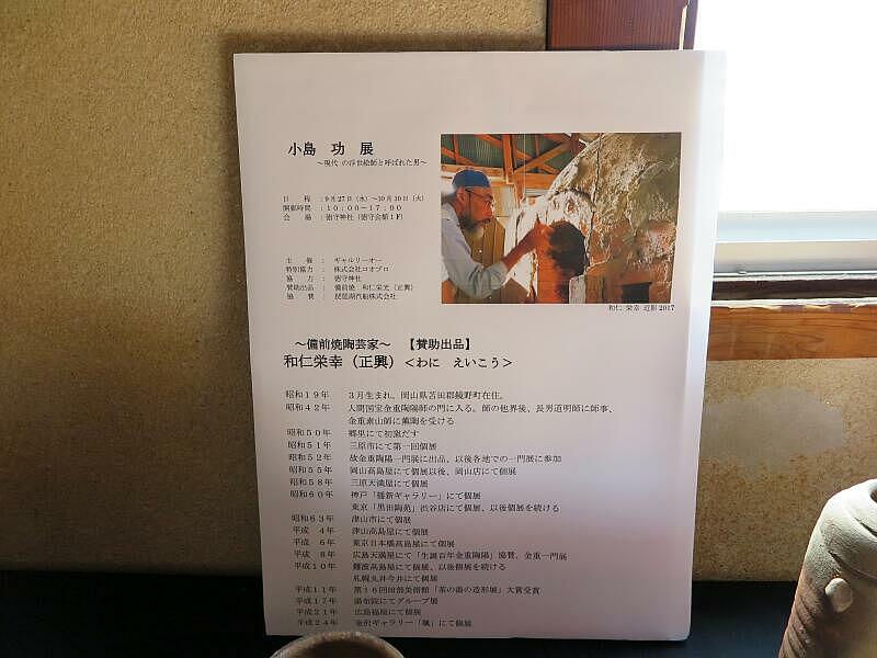 2017年9月27日から10月10日まで、「小島 功展 ~現代の浮世絵師と呼ばれた男~」が宮脇町の徳守会館で始まりました。美酒、美味、美女に愛された作家小島 功。流麗で、やさしくて、時には力強く描かれる線。創り出される世界は果てしなくエロティックで美しい。半世紀以上にわたり生み出された作品群は、どれも圧倒的なエネルギーに満ち溢れている。今回の展覧会では、岡山県苫田郡鏡野町在住 和仁栄幸(正興)氏【備前焼】の作品(酒器を中心に30点程)と共に小島功全盛期時代の作品を原画、版画を含めて60点程展示販売。(文:案内チラシより)(撮影:2017年9月30日)