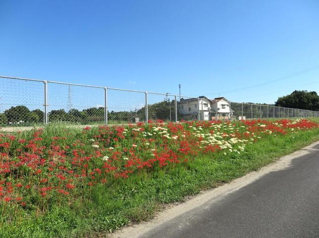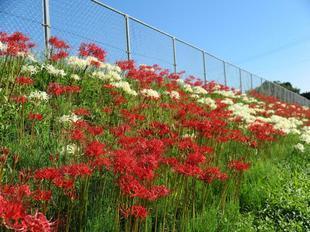川崎の緑地公園近くの土手に咲いた紅白の彼岸花が今年も美しく咲いていました。秋の彼岸の頃に忽然と現れて、真っ赤な花を咲かせるこの花は〔葉見ず花見ず〕とも呼ばれ、葉は花の時期にはなく、花が終わると伸びて来て秋から春まで生い茂ります。(2017年9月30日撮影)(2015年9月23日撮影)