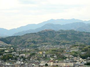 石山(大谷)の石切場跡から津山扇形機関車庫を望む(2015年4月12日撮影)