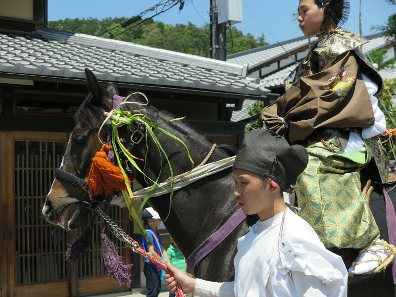 馬は神聖な動物とされ、五穀豊穣・天下安隠を祈って、神馬(しんめ)として奉納された。上賀茂神社の競馬、下鴨神社の流鏑馬(やぶさめ)など、馬が登場する神事は多い。上賀茂神社の競馬は、1093年(寛治7)に、宮中の菖蒲の根合わせで勝った女房たちが、そのお礼に奉納したのが起りとされる。病気平癒祈願に、十列(とおつら)走馬の奉納という盛大なものもあった。(文:倭文地区歴史と文化を語る会)