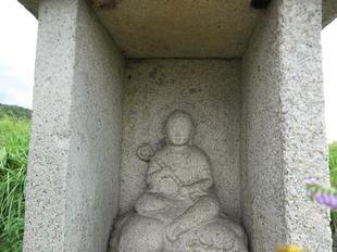勝央町勝間田で稲刈りが始まりそうな田圃の中に鎮座しておられる湯大明神(2020年9月10日撮影)