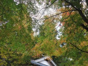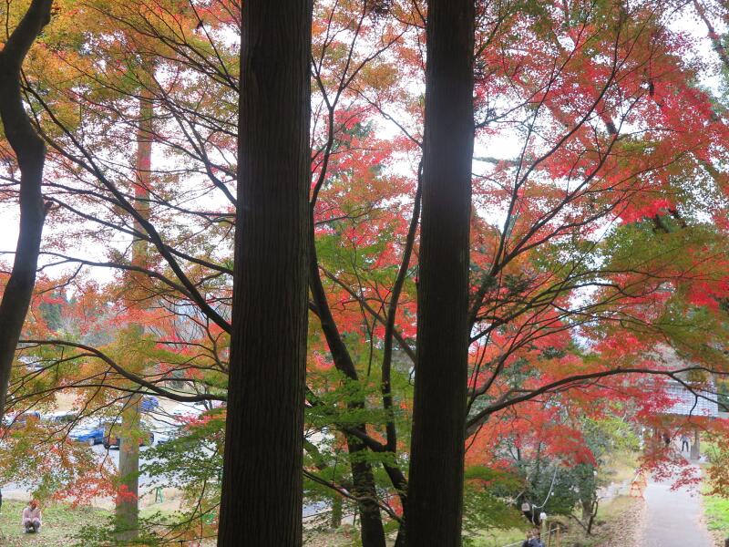 先の台風で大けがをした大イチョウ、少し痛々しい姿ですが紅葉は進んでいました。この日も沢山の方が紅葉した大イチョウを見に来られていました。また、境内のモミジが色とりどりに色づいてとても奇麗で、皆さん盛んにシャッターを切っておられました。