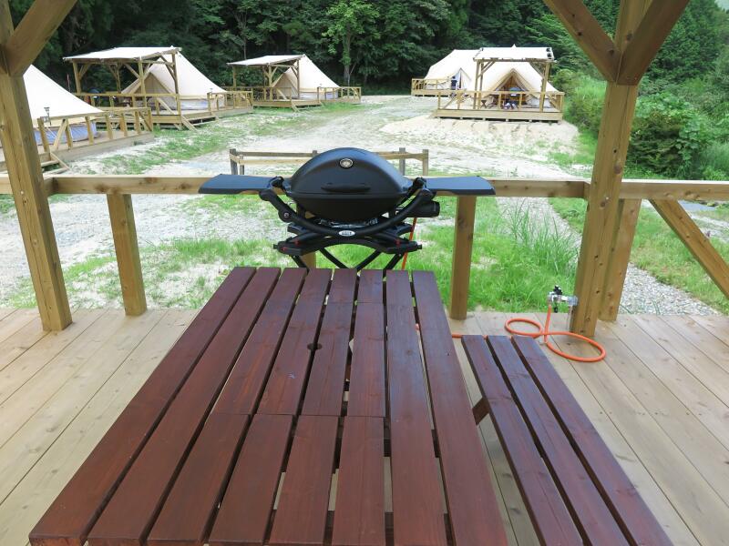 阿波森林公園内に、2021年7月にグランドオープンしたバンガロー5室とテントサイト10室を有するグランピング施設(テントの設営・撤収が不要で、食事の準備などの手間がかからないことから、近年注目を集めているアウトドアのサービス。)です。オープンしてから初めて伺いましたが、家族やお友達と自然を楽しむにはもってこいの所だと感じました。夕食はオリジナルバーベキュー、朝食は地域でとれたお米や野菜を使った和朝食と、こだわりの食事が出来るそうです。この日はお孫さんと参加していたご婦人がニジマスの塩焼きをされていました。(2021年8月1日・5日撮影)