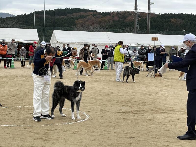 審査発表で表彰を受ける秋田犬です。