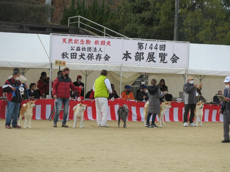 展覧会には、仔犬供覧犬、幼犬AB組の牡部・牝部、若犬牡部・牝部、壮犬牡部・牝部、成犬AB組の牡部・牝部で細かな厳しい審査がありました。その後、結審があり各賞が発表されました。最後に秋保名誉賞(特に優れた犬に送られる名誉賞)が授与されました。秋田犬の凛々しい姿に感動しました。
