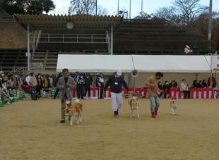 審査発表で順番に並ぶ秋田犬です。