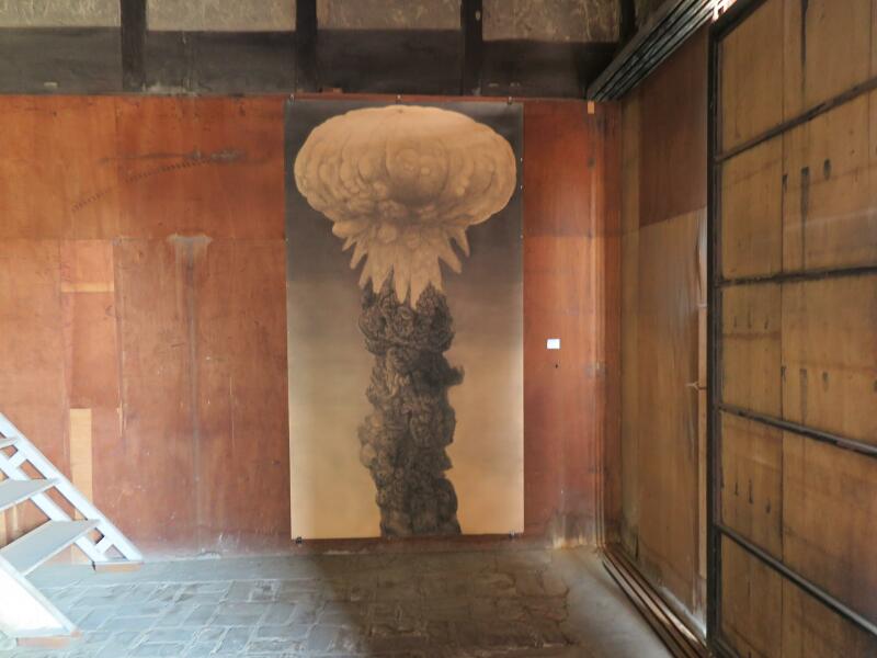 特別第二会場「Nishitera no 蔵(片山家の元米倉)」で展示されている「ふるさとをかえせ」は、東日本大震災で被災した福島県の海岸線を背景に、除染廃棄物が詰められた袋が木炭などで描かれた、高さおよそ1m40cm、幅9mの大作があります。