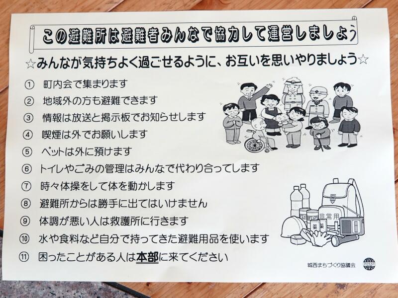 体育館では、新聞紙スリッパを作った後、町内ごとのスペースに着座しました。