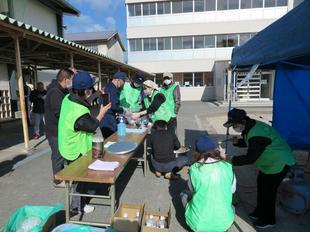 炊き出し試食 和風と中華風のおじやと温かいお茶が配られました。