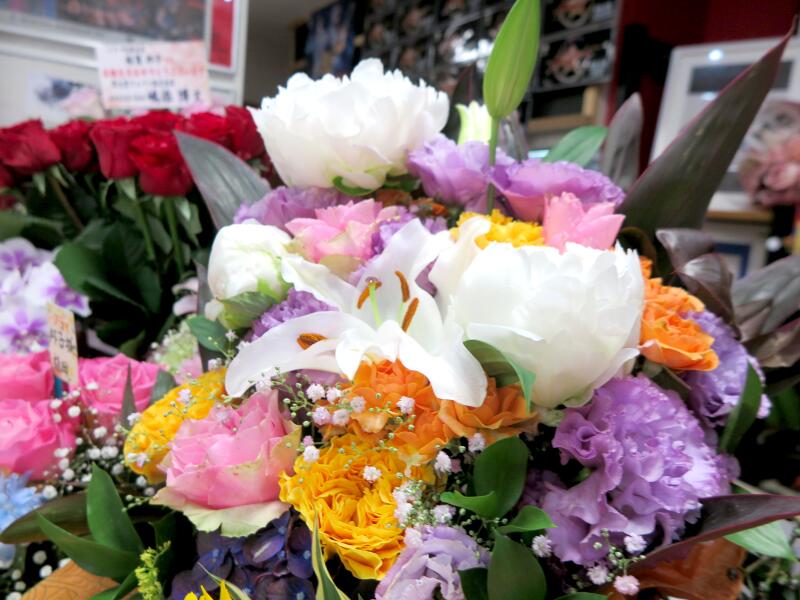 一日早いけどイナバ化粧品店内は、全国のファンの皆さんから届いた沢山の花束が所狭しと並べられていました。「本当に沢山の花束でびっくりよ!感謝感謝!」午前中もお店の中は満員だったそうで、ここの所男性のファンの方が多く来られるそうです。また、浩志さんとはよく連絡を取り合っているそうです。それが元気の源かもしれませんね、ママさん、おめでとうございます。そして、これからも輝いていてくださいね~。