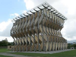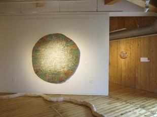 最初吹き抜けの部屋を見上げると壁に掲げられた赤いキノコが印象的でした。そこから通じる通路にはノミで削られたあとに色とりどりのカラフルな色に塗られた楕円形の作品が目につき、その次の部屋にはまたまた、キノコのような作品、2階に通じる階段にもかわいらしいキノコの作品があちことにかくれんぼしているようでした。そして、大きな部屋に掲げられた作品は森で木漏れ日の中にいるような心地よい色使いの作品、また、床には大きなキノコが横たわり長い尾っぽを部屋中に伸ばしている様に私には見えました。作品は中々理解できないのですが、言えるのは色使いの美しさと自然の中にいるような心地よい空間が広がっていて楽しく拝見できたことです。