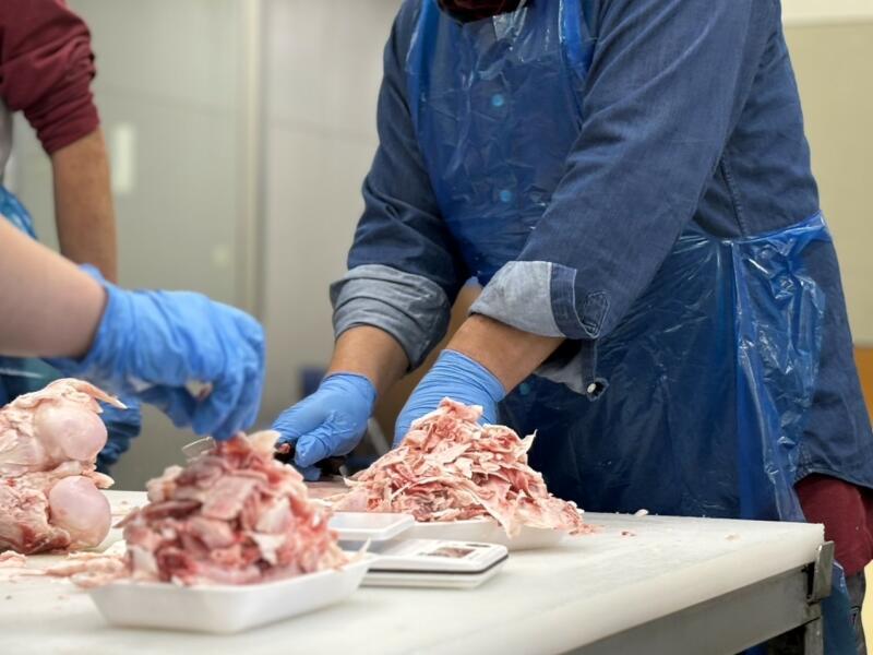 そずり肉マイスター 仁木さんから説明を受け、各自の机でお肉そずり開始。