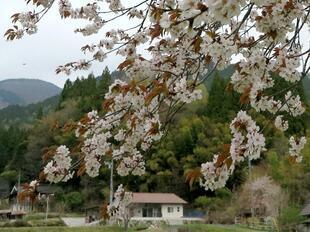 2025年4月21日、尾所のさくらが満開になり青空の中に美しく映えていました。