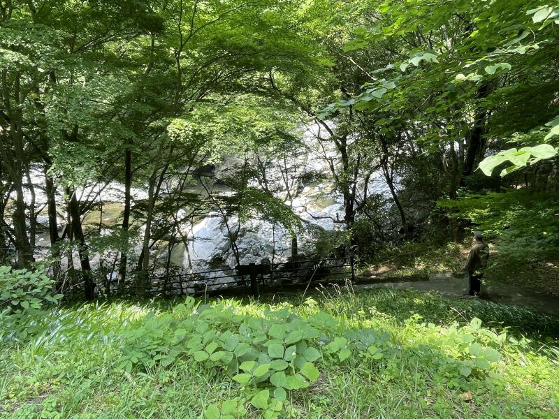 これより二百メートル下流、左岸に「鬼清水」がある。夏でも摂氏十二度の冷泉は作西の三清水の一つと云われ、出雲の国の松平不昧公が参勤交代のおり愛飲されたと伝えられる。