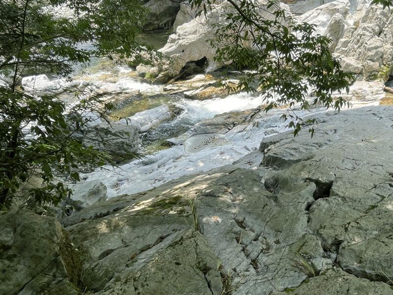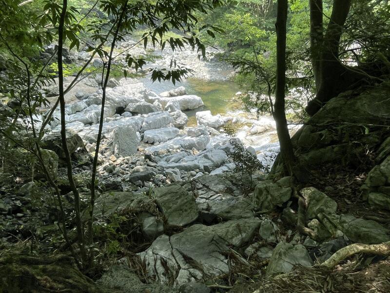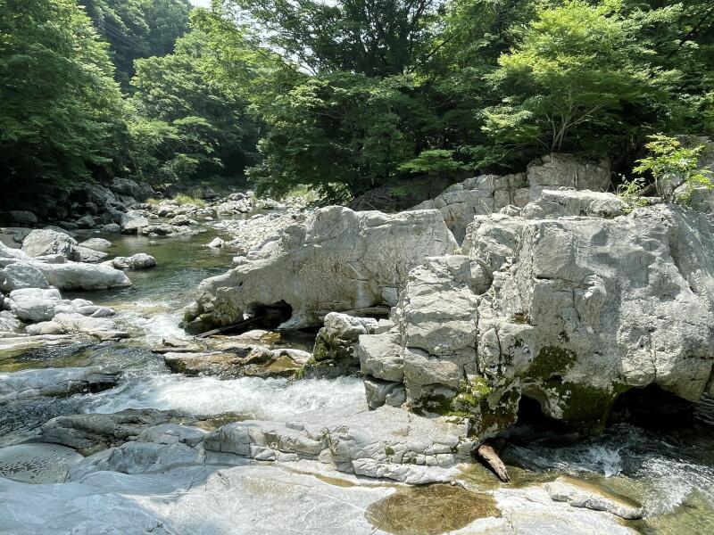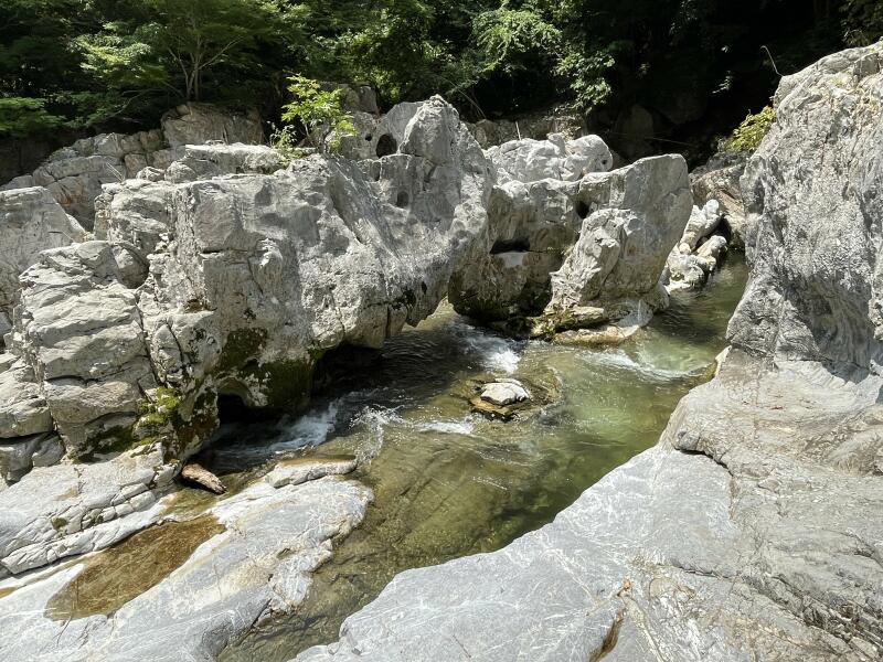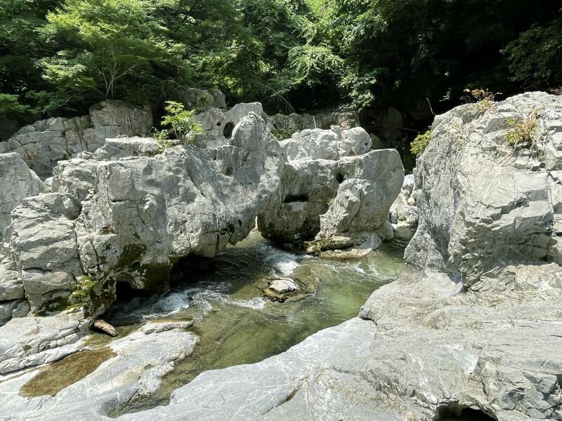 河中の岩には数多の小洞窟があり、流水は或いは激流となり吸い込まれ、或いは噴出して渦巻きを生じ、深い淵には紺碧の水を湛え龍宮の名に背かない。