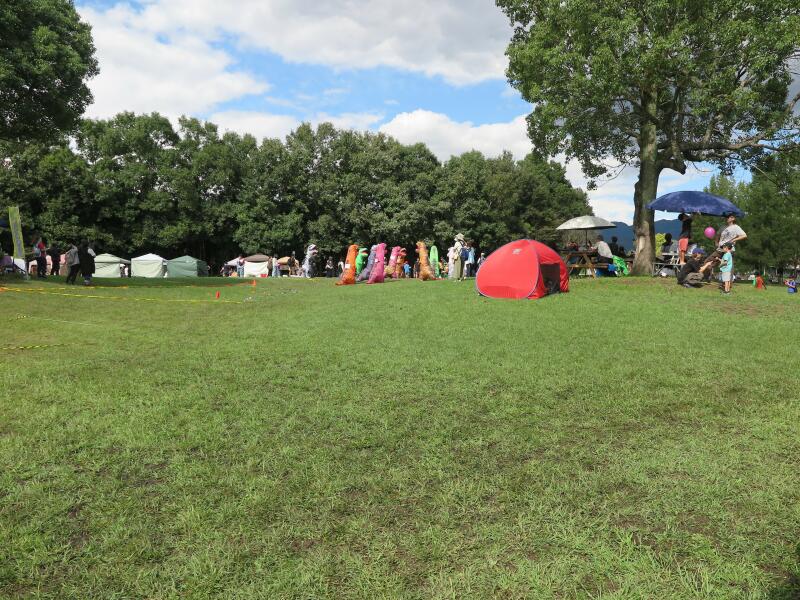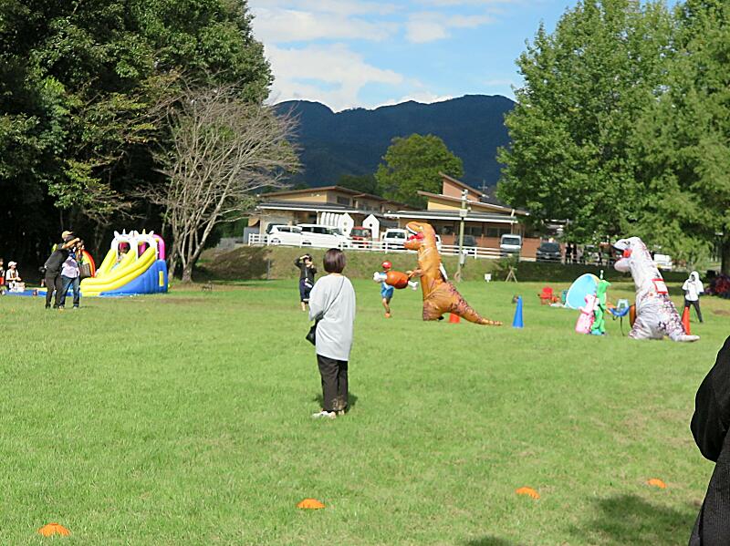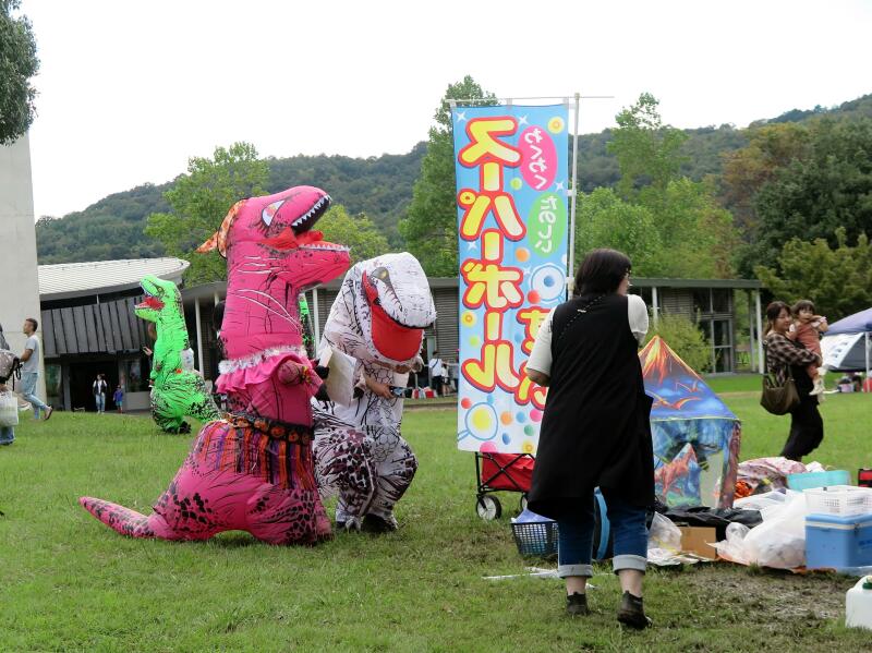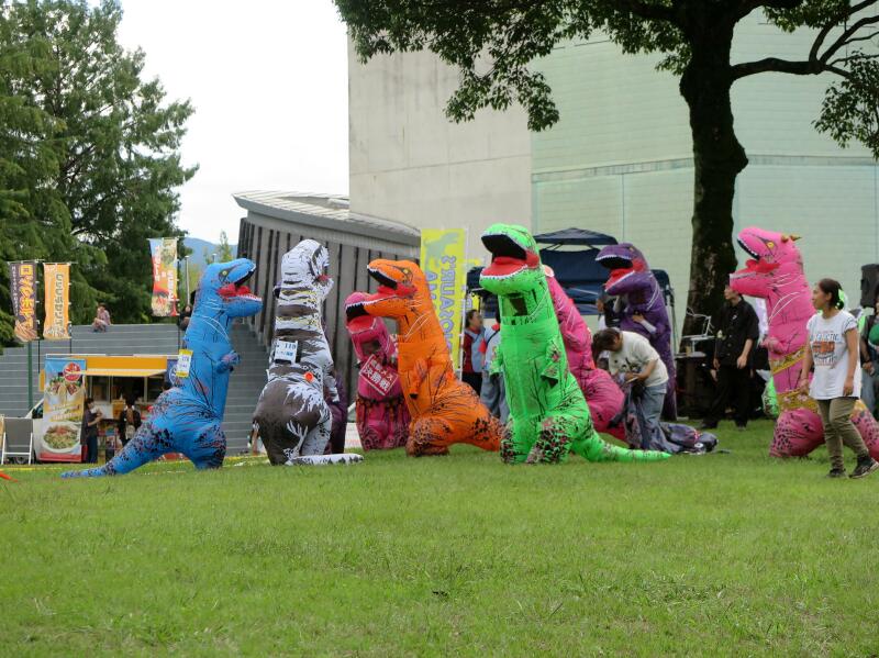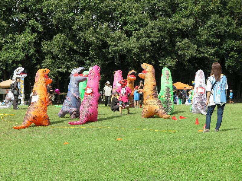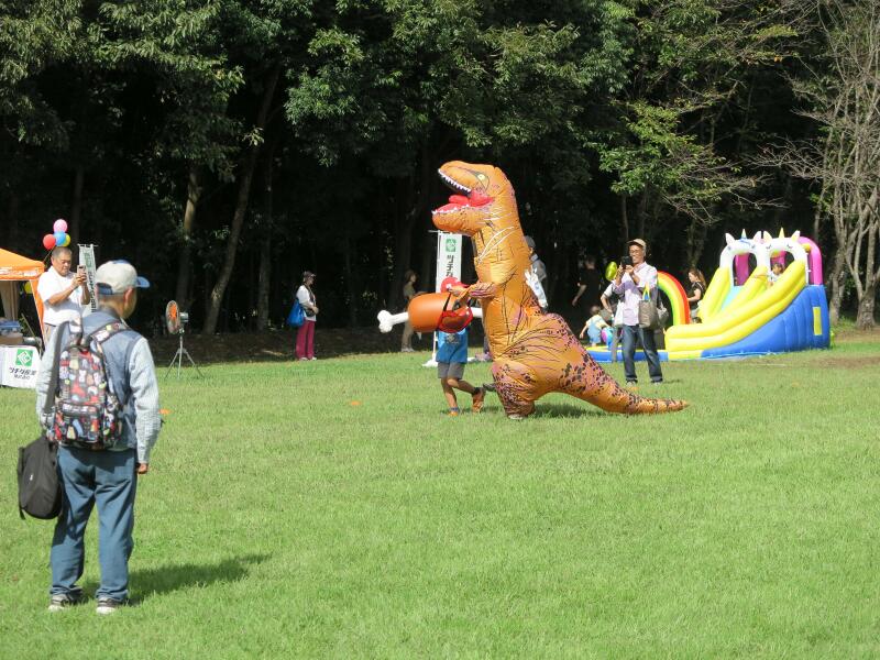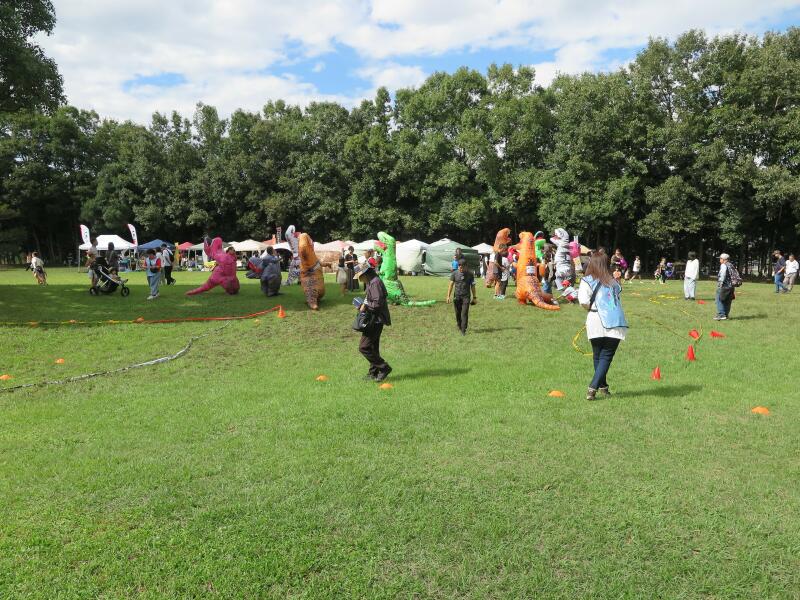 当日は、お天気も回復して汗ばむ陽気になりました。マルシェの会場では飲食屋台・フードカーなどのグルメ屋台と素敵なハンドメイド雑貨のお店、ワークショップ、体験コーナー、リラクゼーション、子ども縁日、ふわふわ遊具、ワンコイン撮影会などが大集合。なんといってもほほえましかったのはティラノサウルスレース で笑わせていただきました。
