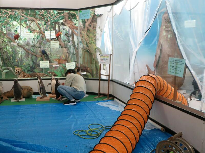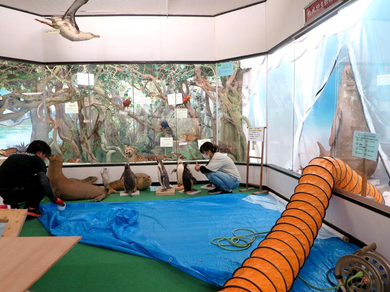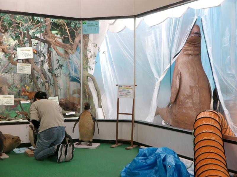 修復中の第9室 極地・南米の動物たち ホコリを掃っています。