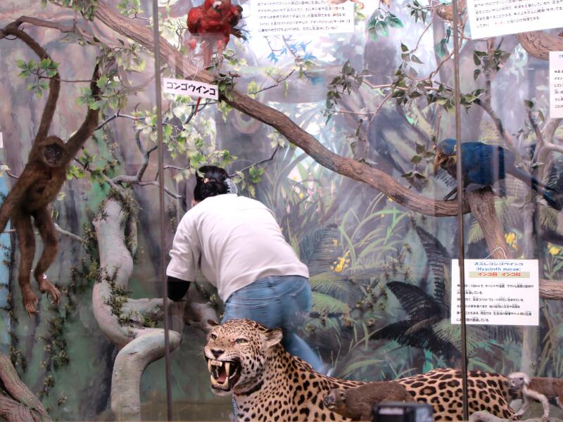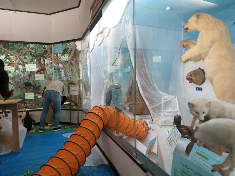 修復中の第9室 極地・南米の動物 ホコリを掃っています。