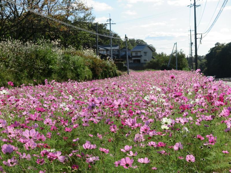 津山市下高倉西の県道345号線沿いのコスモスが毎年美しく咲いてくれます。それを見るのが楽しみでこの道を通っています。県道から高倉神社に行く道路脇にも毎年沢山のコスモスが咲きます。お手入れをする皆さんに感謝です。また、津山市綾部の津山智頭八東線の道路添いのコスモス畑にも立ち寄って写真を撮らせていただきました。ここも毎年綺麗に咲いて私たちを楽しませてくれます。本当にお世話する皆さんありがとうございます。(2025年10月23日撮影)