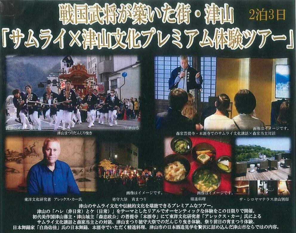津山の「ハレ(非日常) とケ (日常)」をテーマとしたリアルでオーセンティックな体験をこの日限りで開催。初代美作国津山藩主・津山城主「森忠政公」の菩提寺「本源寺」にて東洋文化研究者「アレックス・カー」氏によるサムライ文化講話と森家当主との対談、津山まつり徳守大祭でのだんじり曳き体験、祭り前日の宵まつり体験、日本舞踊家「白鳥佑佳」氏の日本舞踊、本源寺でいただく精進料理、津山市の日本酒造見学を贅沢に詰め込んだ津山市ならではの内容となりました。(写真・文:公益社団法人 津山市観光協会提供)
