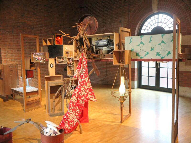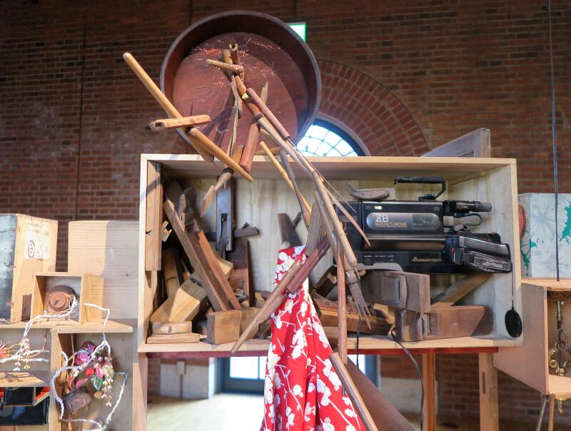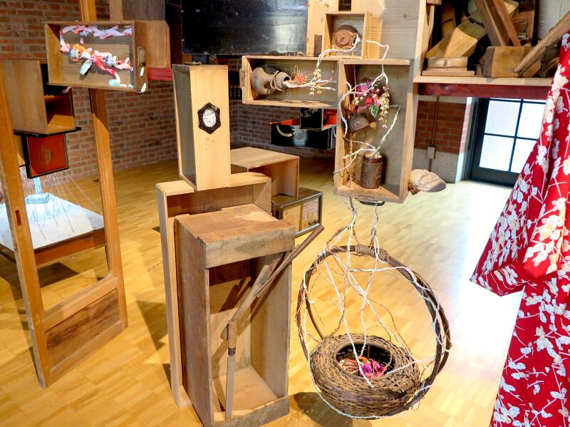 本展示では、個々に受け継がれた家財道具や、住まう家の一部だったモノ、衣服、道具など私たちの周囲にある身近なモノを素材としながら、渾然一体となった空間をつくりだします。そうして収集した物を、立体作品として制作し、インスタレーションの一部として構成していくのです。そうして持ち主と物の持つこれまでの過去の時間と、作品として生まれ変わった現在、それぞれの場所と会場とを繋げることを試みます。
