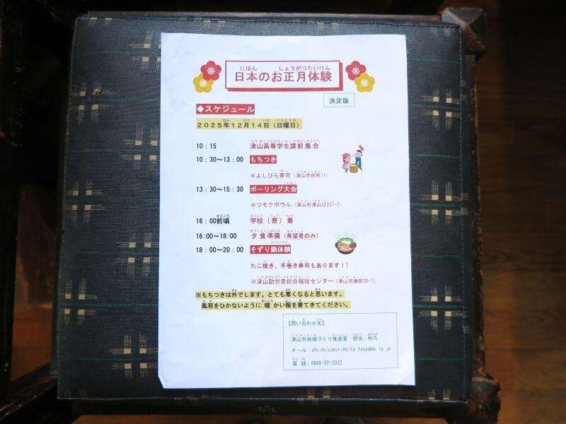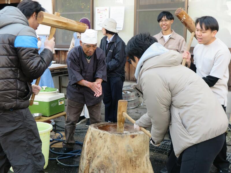 2025年12月14日、津山高等専門学校の留学生(インドネシア・カンボジア・マレーシア出身)の5人が、津山市田町のよしひら寿司前で、地域の人たちに教わりながら賑やかにもちつき体験をしました。