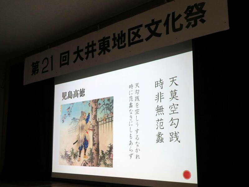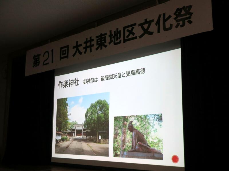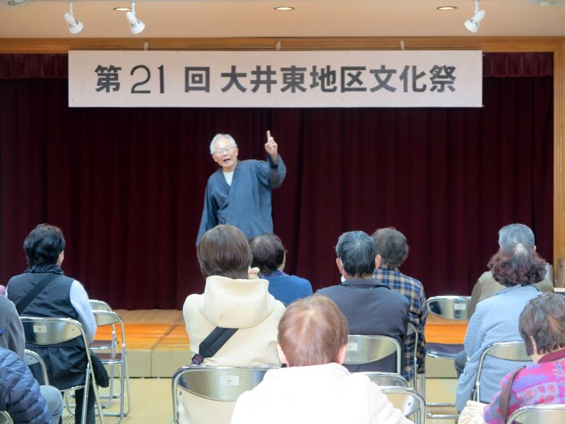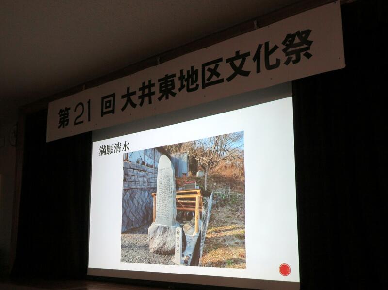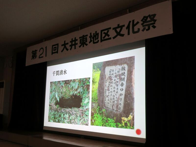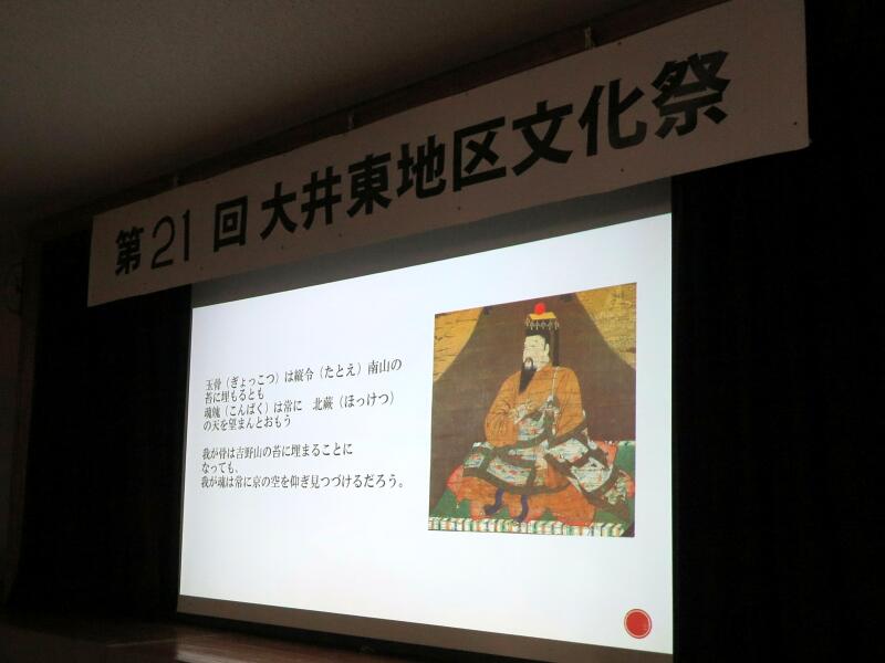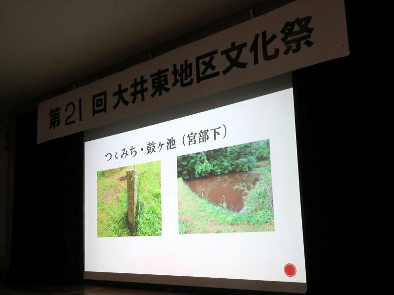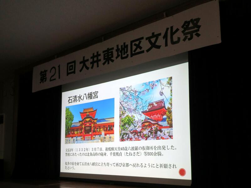 今年の歴史探訪は、後醍醐天皇一行が此の地を通られた時に、一体どんな情景だったか、約700年前に想いをはせながら、大井東地区歴史探訪の驚きや魅力をスライドを使って解りやすく解説されました。また、ステージでは、文ちゃん一座の大道芸、生け花や臨床アートなどが催されました。