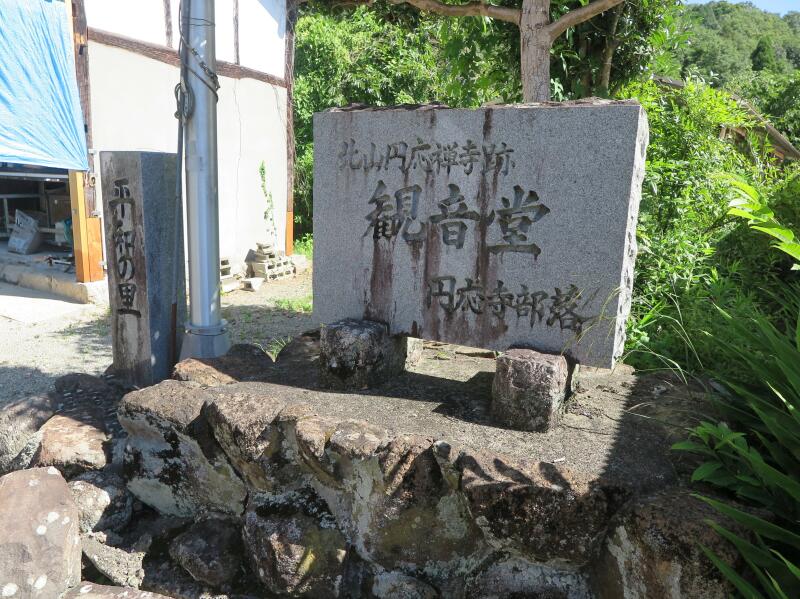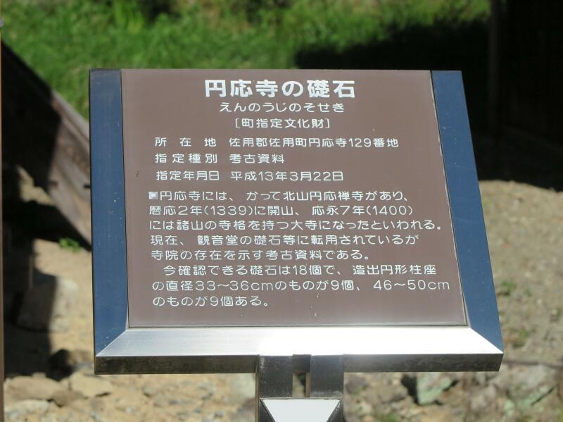 円応寺には、かって北山円心禅寺があり、暦応2年(1339)に開山、応永7年(1400)には著山の寺格を持つ大寺になったといわれる。現在、観音堂の礎石等に転用されているが、寺院の存在を示す考古資料である。今確認できる礎石は18個で、造出円形柱座の直径33~36cmのものが9個、46~50cmのものが9個ある。(文:現地説明版より)