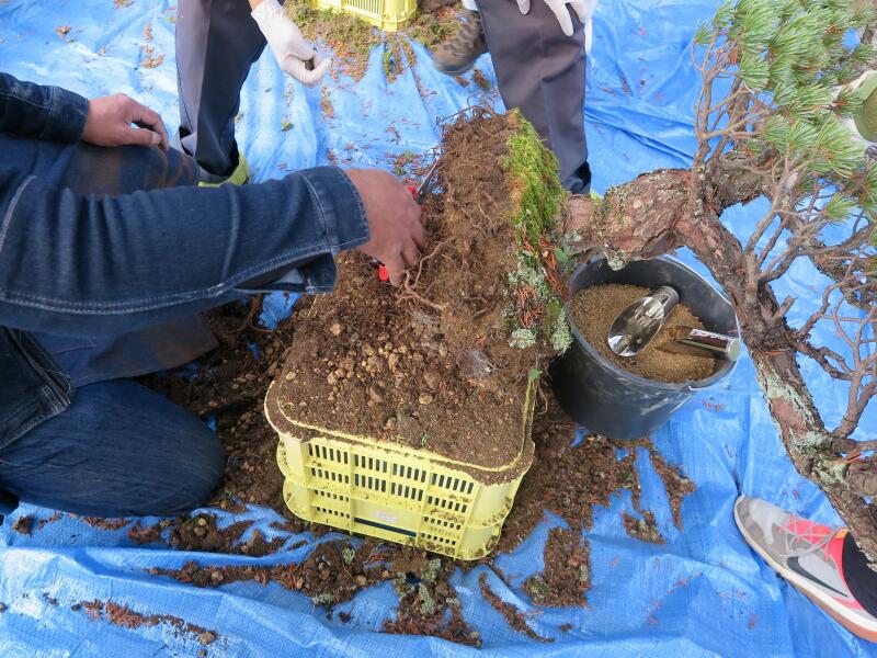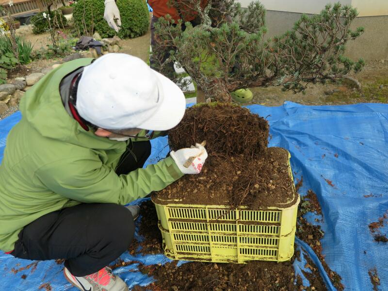 鉢から取り出し、へらの様なもので土を落としていきます。