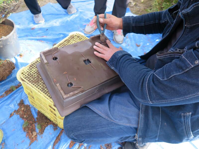 その後、鉢の底に植木が動かないように針金を固定しています。