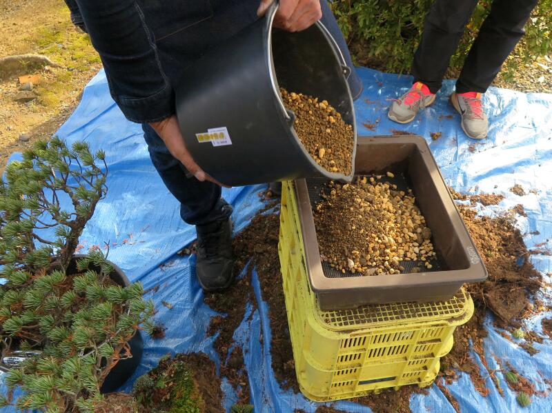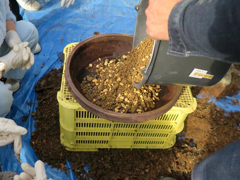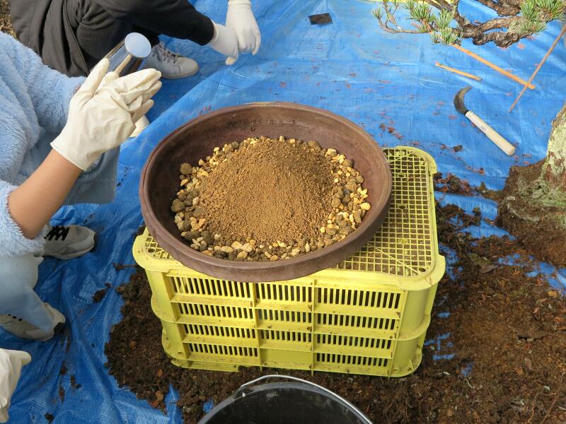 鹿沼土など二種類の土を植木鉢に入れていきます。