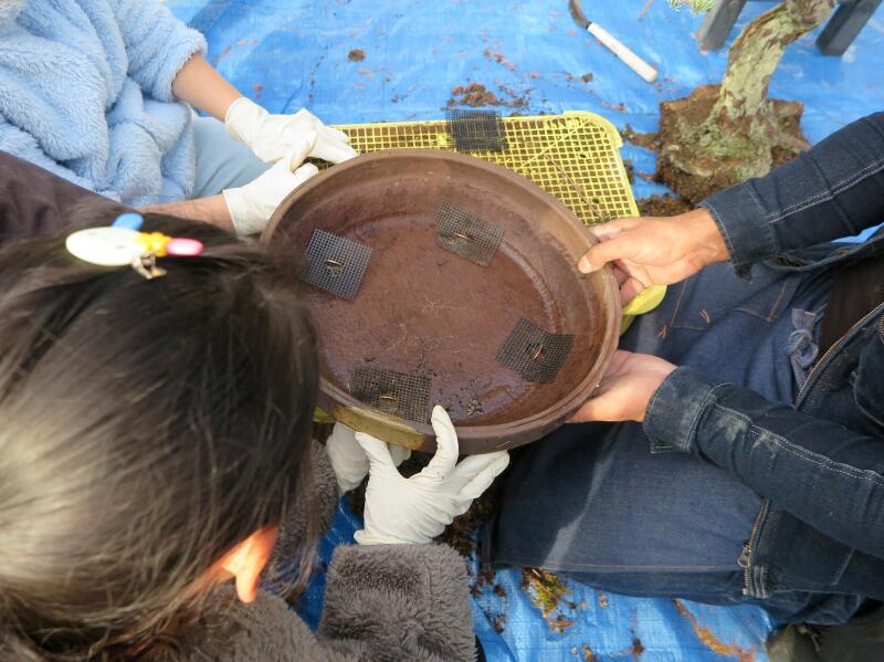 へらの様なもので土を植木の根元に入れていきます。結構土が入るので驚きです。