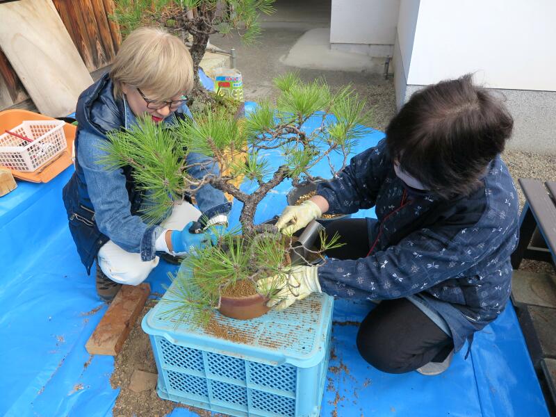 2025年11月24日、津山市西寺町の愛染寺で海外の方や若い方にも人気のある盆栽の植替え・剪定を体験してきました。以前から大きな鉢の松の木等の盆栽等の植替えはどうしてするんだろう?と思っていたので、興味津々で参加してきました。当日は庭師さんの指導を受けながら、お寺に伝わる大きな古い松の盆栽12鉢を道具を使って植え替えしたり、剪定にもチャレンジしました。中には家族で参加された方もいらっしゃいました。大変楽しかったです。