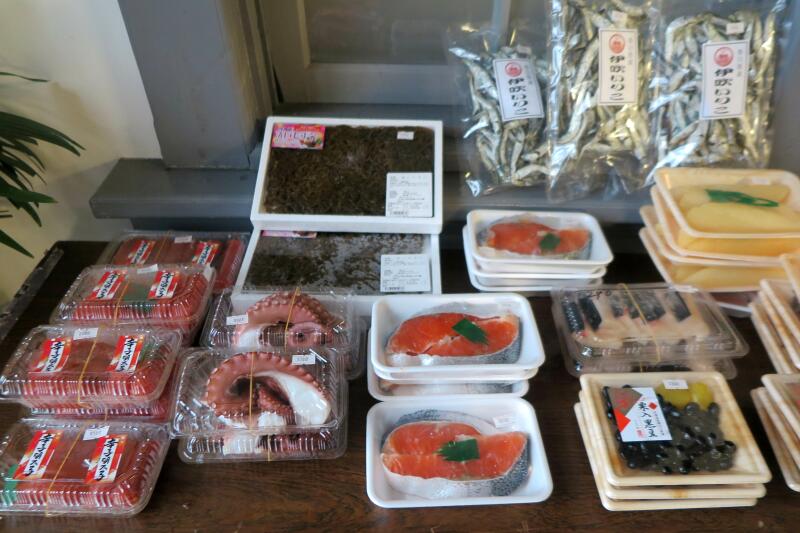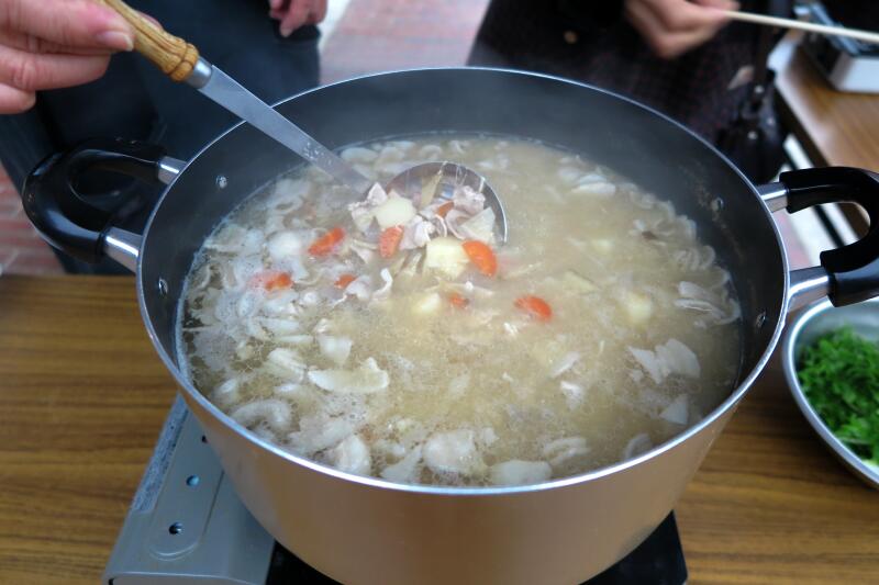 この日は朝から小雨がふる寒い日となりました。恒例の城西朝市の会場は、津山市城西伝統的建造物群保存地区にある、明治42年に土居銀行として建立された作州民芸館です。民芸館の駐車場では野菜や花卉、豚汁、おもちの実演販売などが、また、民芸館内では海産物や惣菜などなどが販売され賑やかでした。