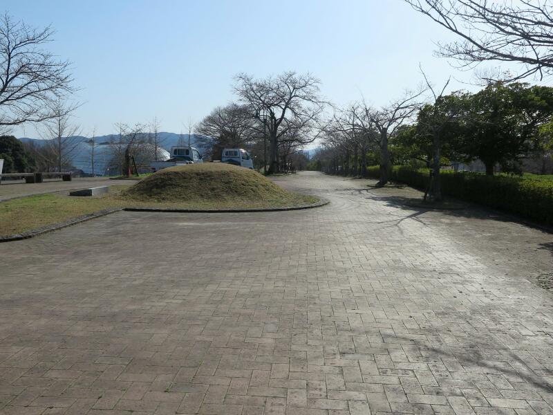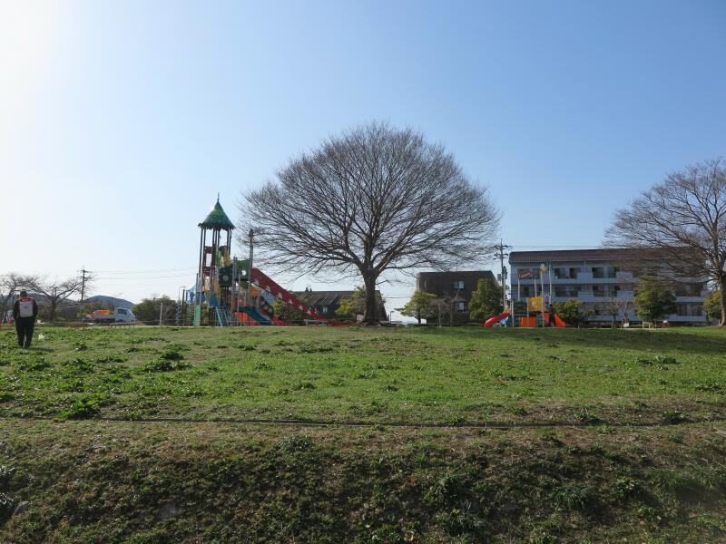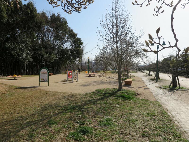 春には桜の花やモクレンがきれいです。また、円盤の様なものは、大田西奥田遺跡の縄文時代の住居跡だそうです。1993年の発掘調査により、直径3.2m・深さ25cmの竪穴式住居が発見されました。この住居跡は今から7~8千年前の縄文時代早期のもので、この時期の住居跡としてはきわめてめずらしいものです。又、この住居跡の近くからは落し穴もみつかり、この付近に集落が広がっていたものと思われます。このため遺跡の範囲を盛土のうえ遺跡広場として保存することにしました。