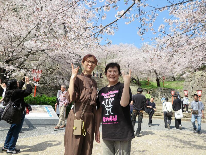 4月4日(土)の天気予報が雨なので急遽3日に津山城(鶴山公園)まで撮影に行ってきました。この日はイナバ化粧品店でお会いしたファンの方と合流して記念に一枚撮らせていただきました。一言「さくらが咲いている季節に来るのは初めてで最高です。」とのことまた来てくださいね。