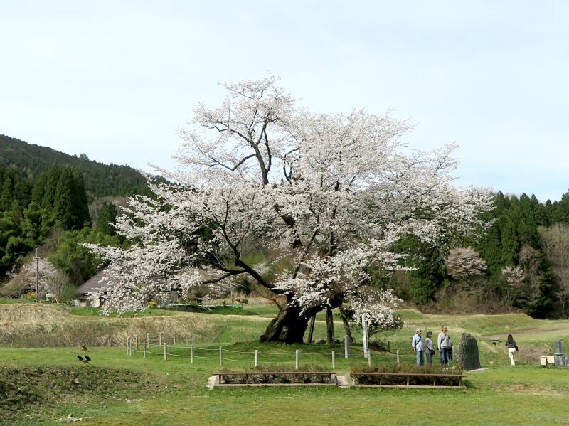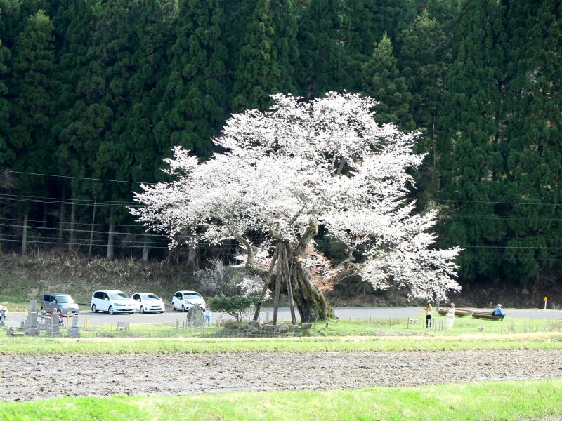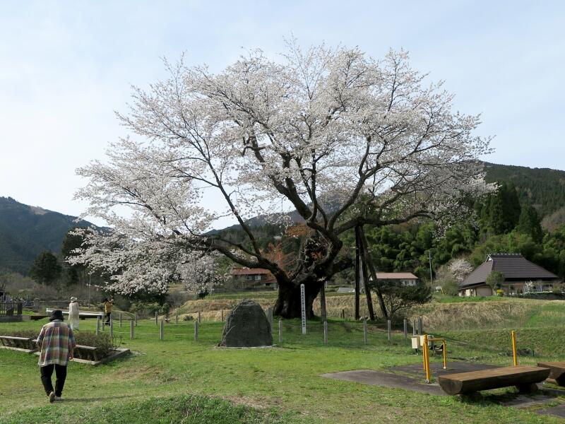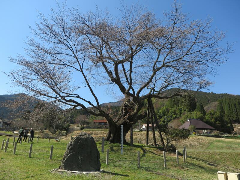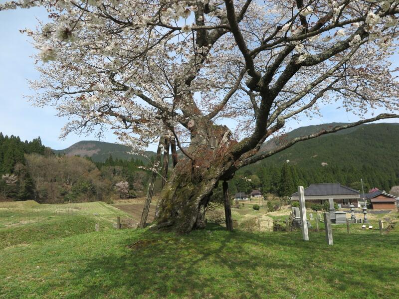 標高480mに位置する1本立ちの山桜で、推定樹齢550年です。高さ約5.9m、枝張り東西約20m、南北約15mです。地上約4mのところから四方に分枝しています。樹姿は壮大にして優美で高雅な気品があります。樹下の眺望もまた佳絶です。宝徳2年(1450)頃、山伏が倉見越えの途中この場所で休み、持っていた杖を残したまま発ちました。その杖が根付いて今の桜の木になったと伝えられています。例年、4月20日前後に満開を迎えます。(県指定天然記念物)(2008津山市教育委員会発行、津山市の文化財より)