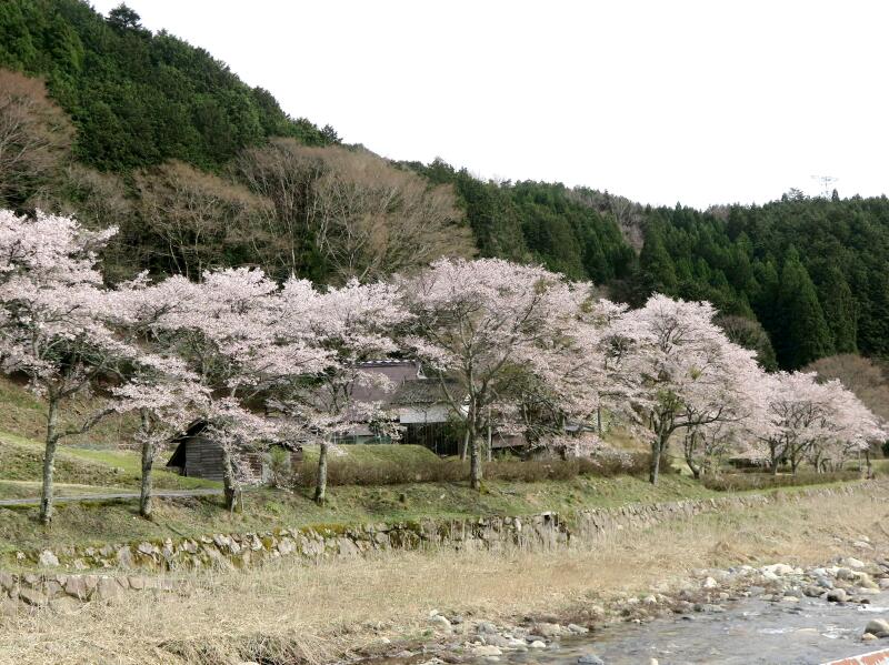 阿波に入るとすぐ川沿いのさくらの花が満開です。 竹の色がひときわ目立っています。
